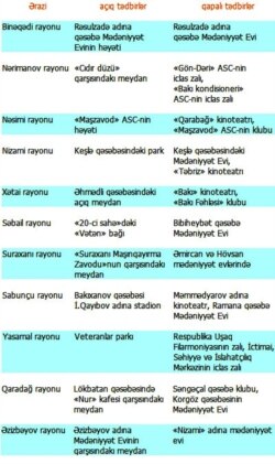 Siyahıda ölkənin bütün şəhər və rayonlarında açıq və qapalı tədbirlərin keçirilməsi ilə bağlı yerlər də bu qaydada göstərilib. Bununla yanaşı, Naxçıvan Muxtar Respublikasında tədbirlərin keçiriləcəyi yerlər siyahıda əksini tapmayıb.