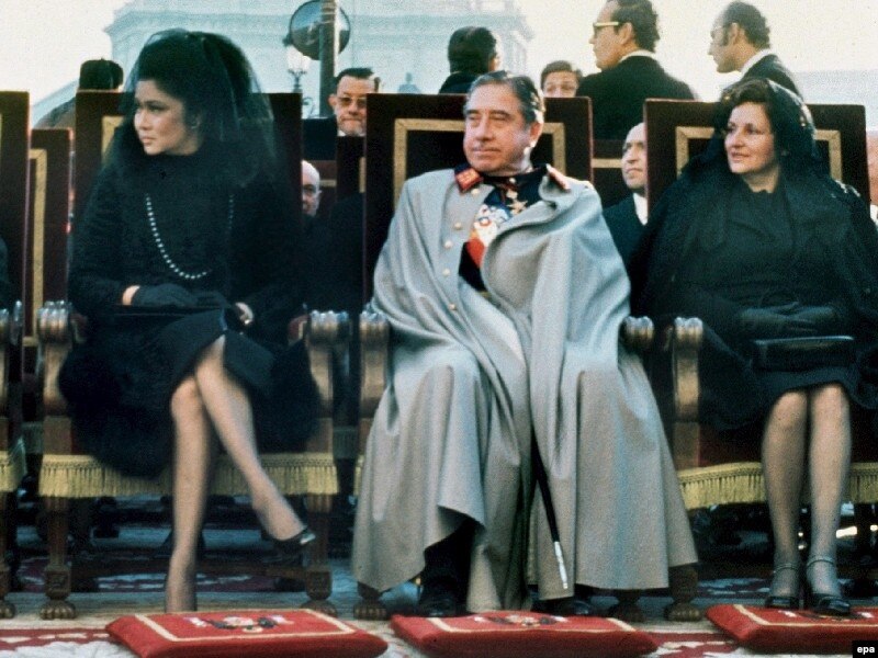 Çilinin keçmiş diktatoru Pinoçet, onun arvadı Lucia Hiriart (sağda) və İmelda Markos İspaniyanın keçmiş diktatoru Frankonun dəfnində. 1975