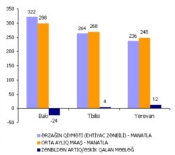 Ərzağın qiyməti barədə məlumatların analizi Bakıda dolanışığın qonşu Yerevan və Tbilisidən daha çətin olduğunu göstərir. Şərti ailənin başçısı Yerevan və Tbilisidə orta aylıq maaşla ailəsinin minimum ərzaq ehtiyacını ödəyə bilir, Yerevanda 12, Tbilisidə 4 manat da artıq pulu qalır. Bakıda isə bu ailənin başçısı təkcə minimum istehlak xərcləri üçün maaşından savayı haradansa, ayda 34 manat da tapmalıdır.