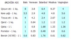 Azərbaycan mətbəxində ən çox istifadə olunan bir neçə malın Bakıda və başqa şəhərlərdəki qiymətlərinə nəzər salaq: (Qiymətləri manata çevirmişik.)