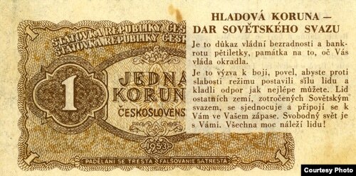Çexoslovakiyanın yeni dövriyyəyə buraxılan pulunun oxşarı çap olunmuş, onun da üzərində təbliğat mesajları yazılaraq sərhədin o biri tərəfinə atılmışdı