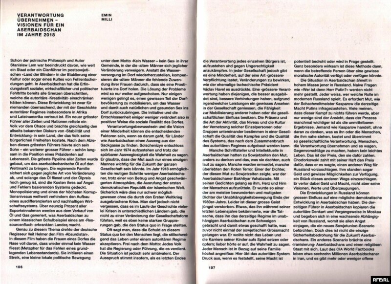 В своей статье Эмин Милли рассказывает о молодежи, которая посредством виртуальных и реальных коммуникационных сетей, объединяется в своем стремлении изменить общество, а также говорит о необходимости восторжествования демократии для решения проблем. В собрание вошли два рассказа Али Акбера, один из которых называется "Туалетная история", а второй рассказывает о Туркменбаши и жизни после его смерти.