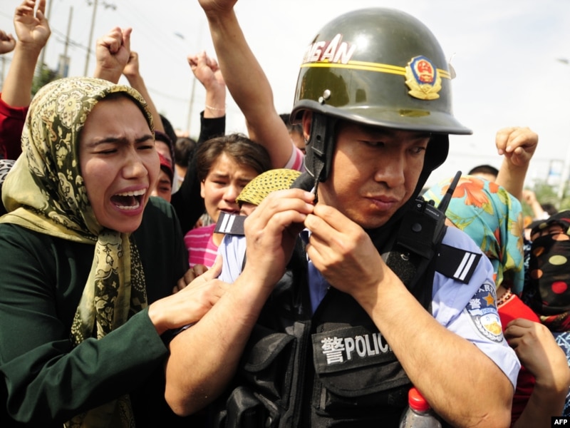 Uyğur etirazçılar və polis. Xinjianq vilayəti, 7 iyul 2009 Çin hökuməti belə kadrların xaricdə yayınlanmasını istəmir.