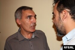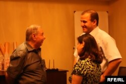 Əkrəm Əylisli Eyvaz Zeynalova "Ədəbi Azadlıq" mükafatını təqdim edir.