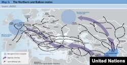 Hesabata görə, Əfqanıstandan Avropaya narkotik daşıyanların yeni – «Şimali Balkan yolu» adlandırdığı marşrut məhz Azərbaycandan keçir: Əfqanıstan, İran, Azərbaycan, Gürcüstan və Qara dəniz vasitəsilə Bolqarıstana ildə ümumi heroin dövriyyəsinin 7 faizi daşınır.