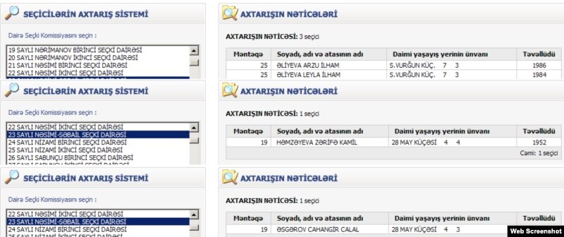 Мы сравнили указанные на эмиссионном проспекте Государственного комитета по ценным бумагам адреса Алиевой Арзу и Гамзаевой Зарифы с указанными в списке избирателей Центральной избирательной комиссии (скриншот слева).