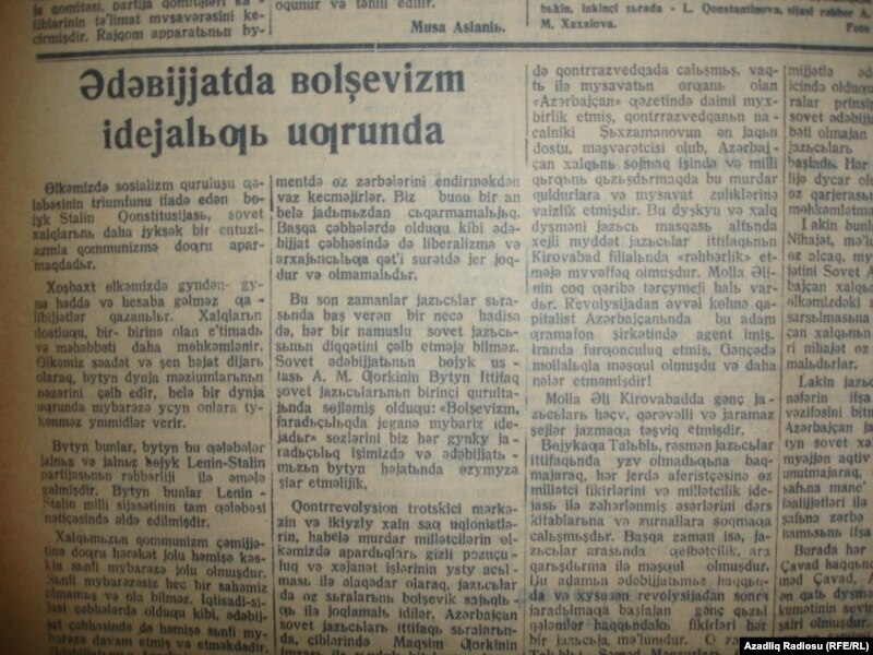 “Kontrrevolusion trotskiçi mərkəzin və ikiüzlü xain sağ uklonistlərin, habelə murdar millətçilərin ölkəmizdə apardıqları gizli pozuculuq və xəyanət işlərinin üstü açılması ilə əlaqədar olaraq, yazıçılar da öz sıralarını bolşevik sayıqlığı ilə yoxlamalı idilər.