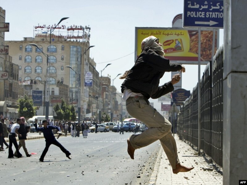 Yəməndə etiraz askiyası iştirakçıları hökumət tərəfdarlarını daşa basırlar, 17 fevral 2011