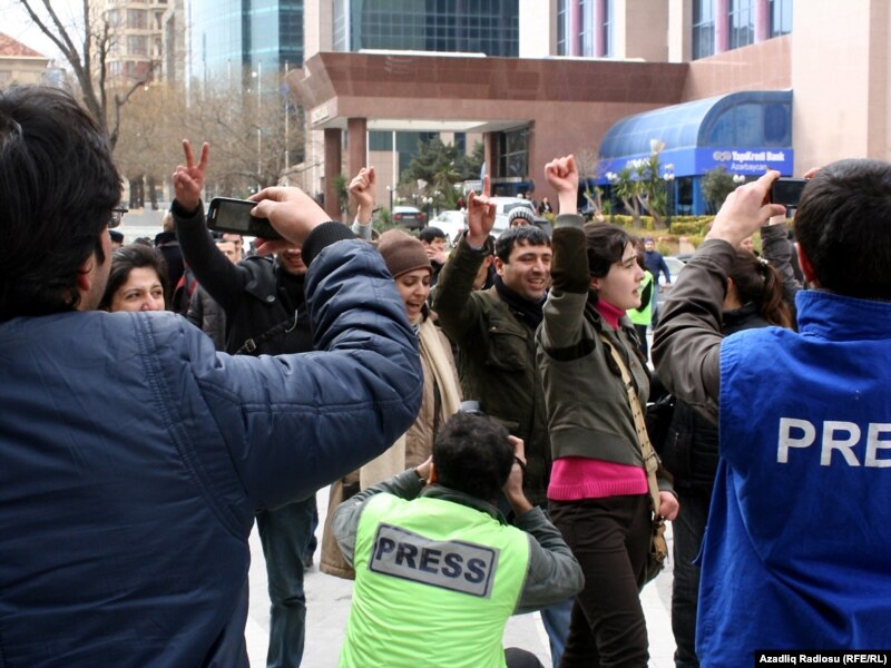 Несколько журналистов - Шахвеледа Чобаноглу, Афгана Мухтарлы, Сеймура Газиев, руководителя Центра мониторинга выборов Анара Мамедли скандировали лозунги «Свободу Эйнулле Фатуллаеву!», «Отпустить Бахтияра Гаджиева!», «Свободу Даянату!», «Свободу Джаббару!». Полиция задержала их ненадолго и отпустила, кроме сотрудника газеты «Bizim yol» Афгана Мухтарлы.