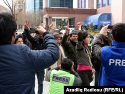 Офицер полиции несколько раз ударил кулаком фоторепортера РадиоАзадлыг Аббаса Атилая в лицо, шею и в живот. Атилай бежал с фотокамерой за преследовавшими участников акции полицейскими, когда споткнулся и упал. Полицейский подбежал к нему и стал наносить удары рукой в лицо и в шею. Вот что говорит А.Атилай: