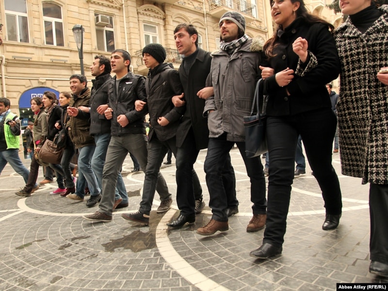 Группа молодежи провела акцию на центральной улице Баку - Низами, которую называют "Торговая". Они прошли от Площади Фонтанов до бывшего здания Национального банка, выкрикивая лозунги «Azadlıq!»-«Свобода!» и «Отставка!». Полиция задержала нескольких участников акции, затем отпустила их.