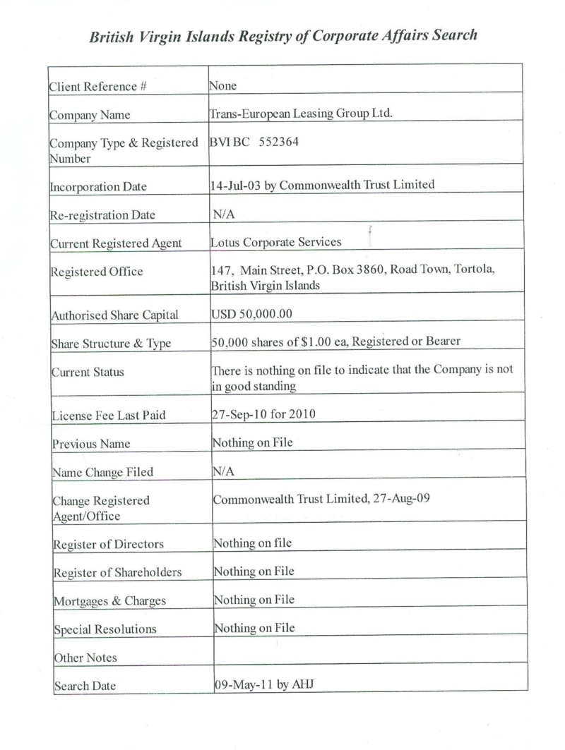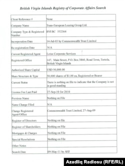Нам удалось узнать у структуры British Virgin İslands Registry of Corporate Affairs Search, которая занимается регистрацией компаний на Британских Виргинских островах, что компания Trans European Leasing Group LTD, то есть учредитель ООО «Bakı XXI Əsr», зарегестрирована 14 июля 2003 года. По информации, сообщенной РадиоАзадлыг, при регистрации компании не были указаны ни юридические лица, ни имена учредителей.