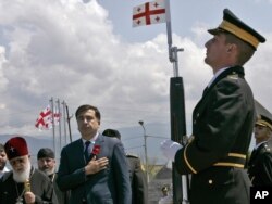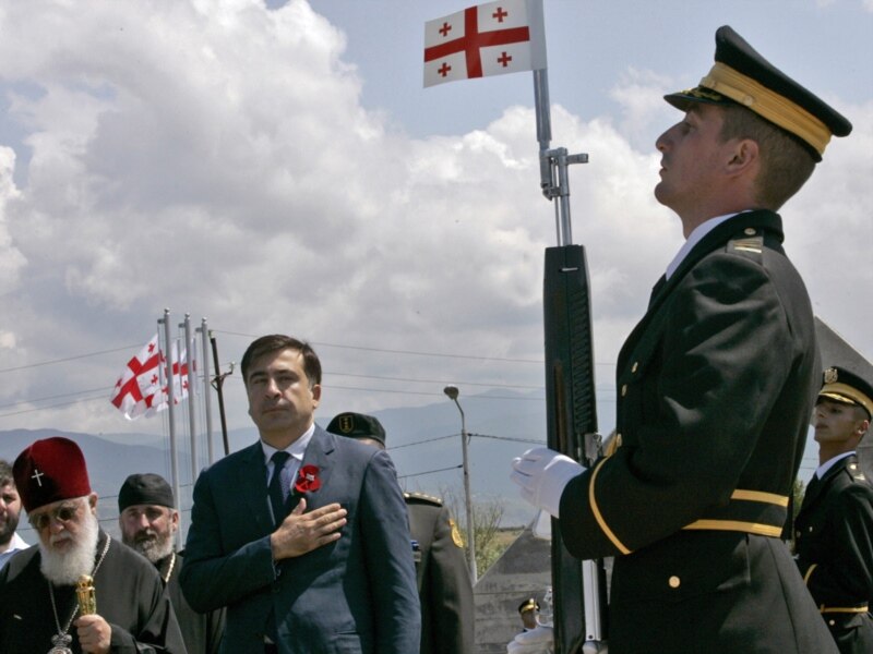 Gürcüstan prezidenti Rusiya ilə müharibədə ölən gürcü əsgərlərinin qəbrini ziyarət edir. Tbilisi. 8 avqust 2011