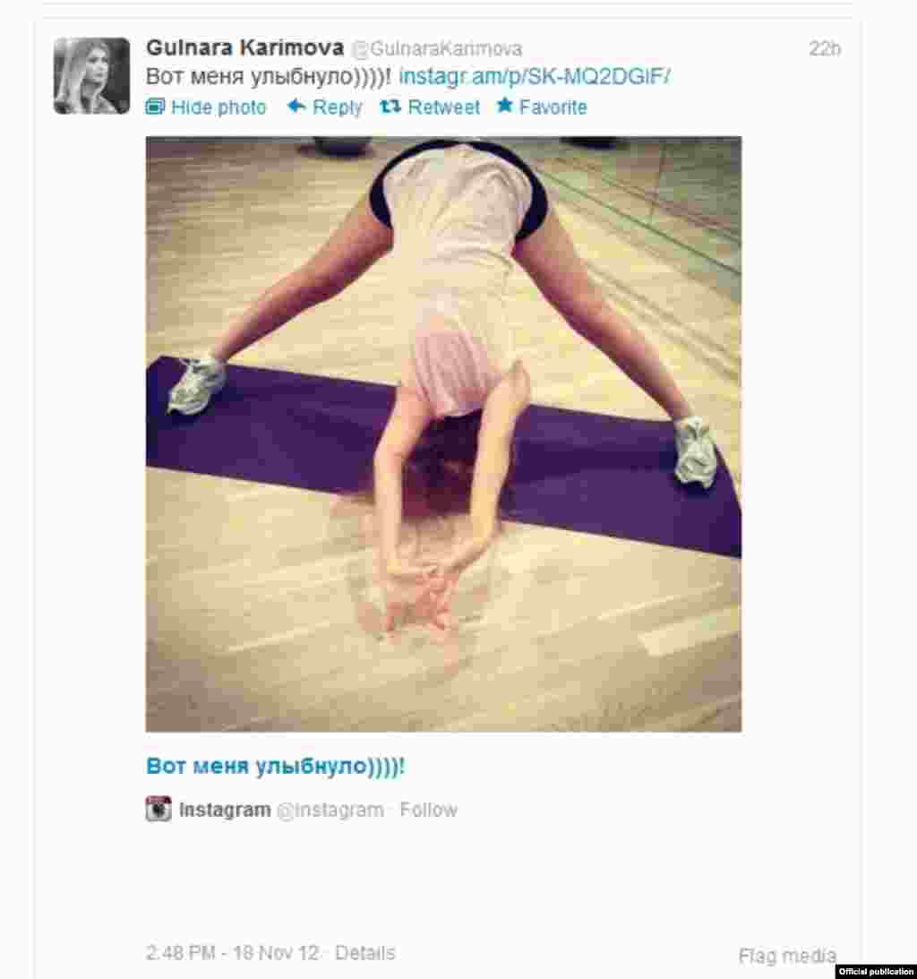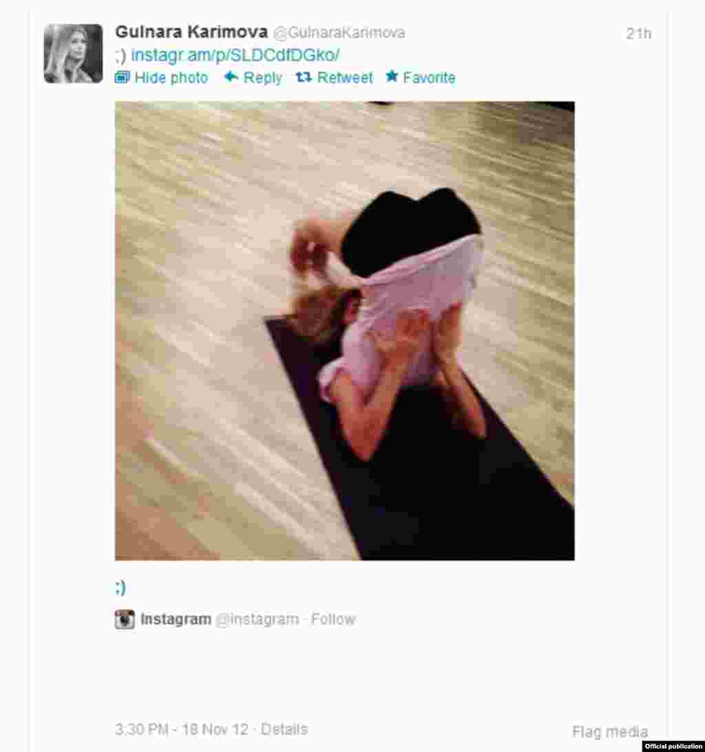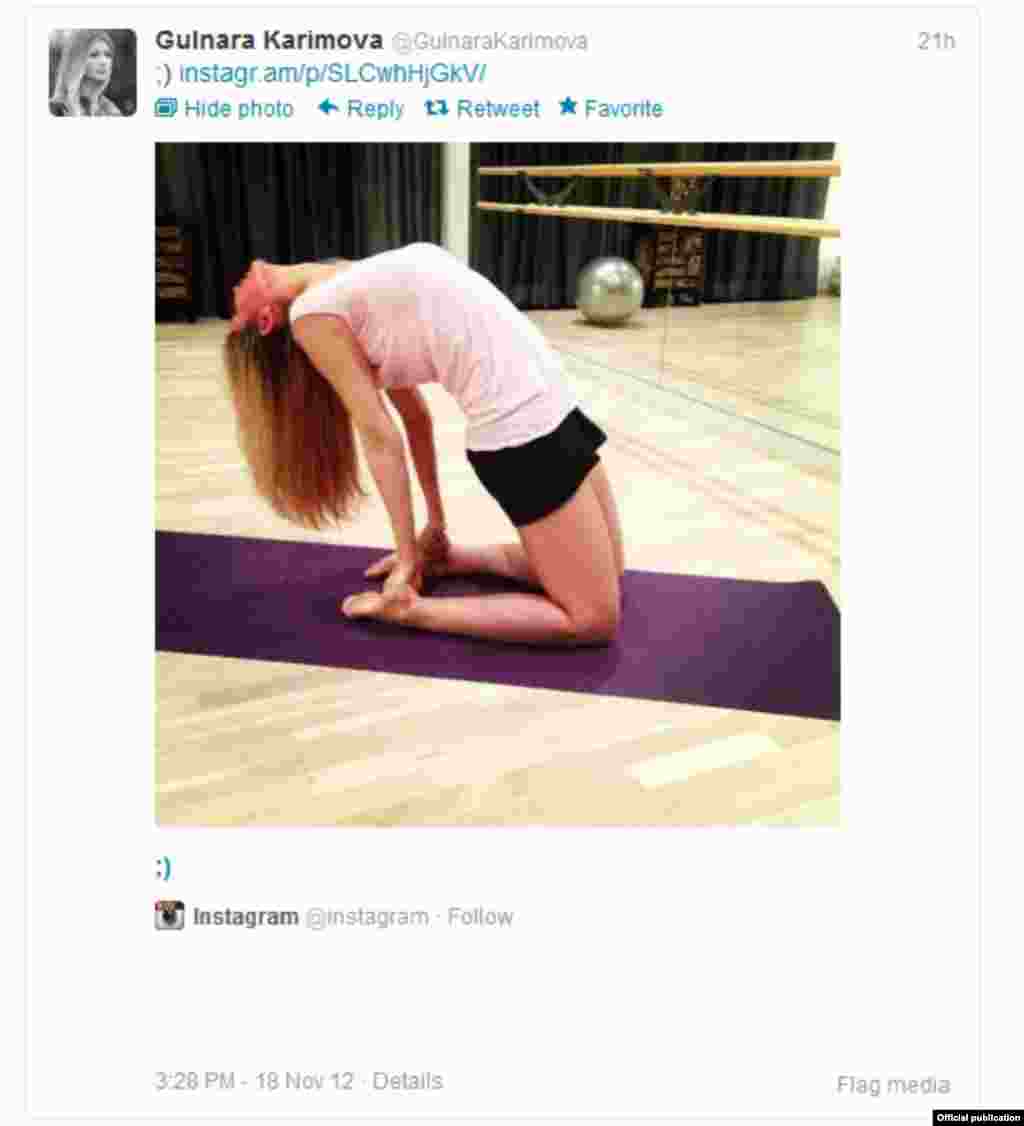 Özbəkistan prezidentinin qızı Gulnara Karimova noyabrın 18-də özünün Twitter hesabında idman edərkən çəkilən fotolarını paylaşıb.