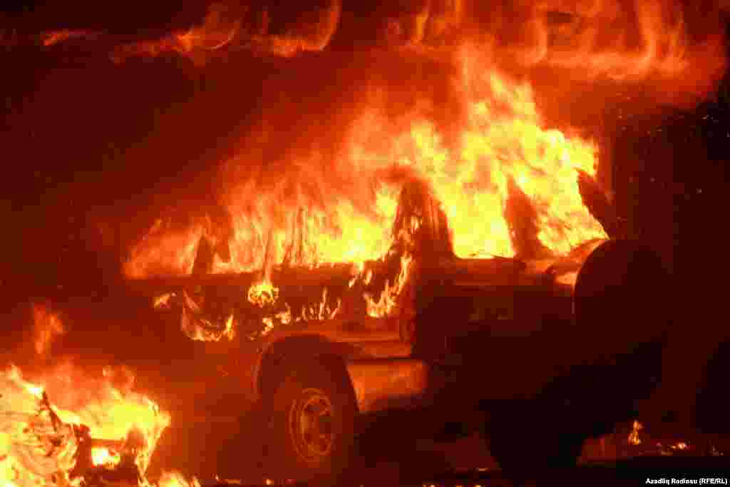 Ərazidə olan Əmək və Əhalinin Sosial Müdafiəsi naziri Füzuli Ələkbərovun oğlunun maşını da daxil olmaqla bir neçə bahalı avtomobili yandırılıb. AzadlıqRadiosu hadisə yerindən fotoları təqdim edir:
