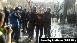 15.48 Маленькие группы молодежи скандируют лозунги против солдатских смертей. Полиция заталкивает их в автомобили и автобусы, и вывозит с территории. Среди задержанных есть женщины, а также представители СМИ. Полицейские в спецзащитных средствах и с дубинками полностью контролируют выходы на площадь Фонтанов с улицы Низами. Водометные машины стоят наготове.