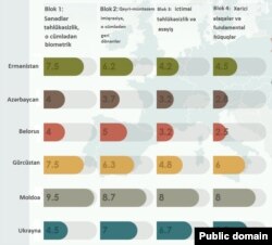 İctimai təhlükəsizlik blokunda Gürcüstan 4,8, Ermənistan 4,2 , Ukrayna 6,7 , Moldova 8 bal toplayıb.