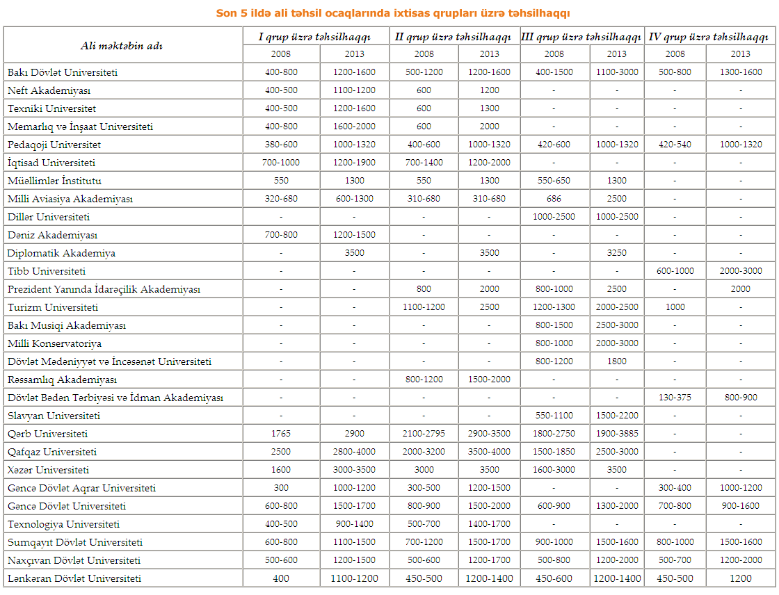 Son 5 ildə ali təhsil ocaqlarında ixtisas qrupları üzrə təhsilhaqqı