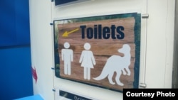 Orada tualetlərin yerini nişan verən bir lövhə vurublar divara. İşarələrin biri qadın, biri kişi, o biri dinozavr.