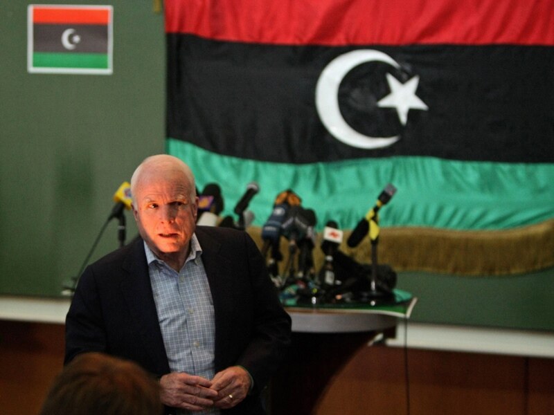 Маккейн считает что у Каддафи остается небольшой выбор: либо искать убежища у Уго Чавеса, либо оказаться в руках международного уголовного трибунала, либо последовать за Гитлером. Сам Маккейн предпочитает второй вариант, но, по его мнению, для победы над Каддафи потребуются серьезные усилия, особенно после того, как ему удалось добиться патовой ситуации в противостоянии с повстанцами.