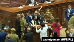 Təhlükəsizlik xidməti Tovmasyanı və başqa müxalifətçi deputatları zaldan çıxarıb.