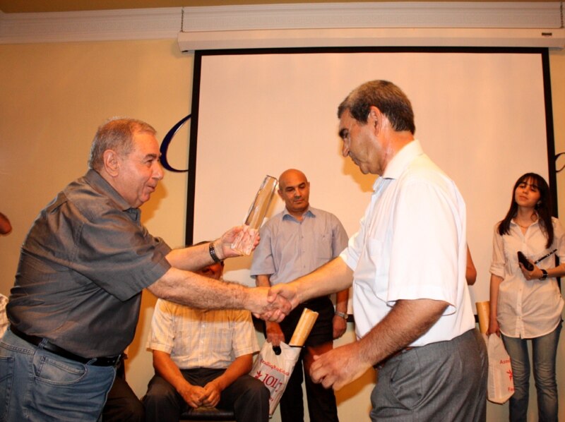 Əkrəm Əylisli "Ədəbi Azadlıq-2010" müsabiqəsinin qalibi - yazıçı Eyvaz Zeynalova mükafatı təqdim edir. 10 iyun 2010